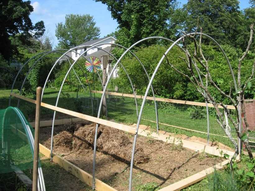 Для сооружения подобной конструкции подойдут также любые другие подручные материалы: рейки, изделия металлопроката, ПВХ-трубы и т. д. Последние наиболее удобны, поскольку имеют достаточную прочность, хорошую гибкость и высокую стойкость к атмосферным осадкам.