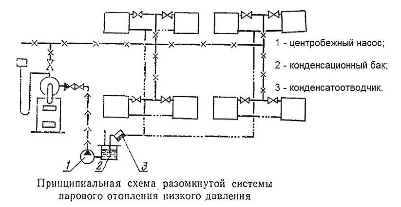 Схемы открытой и закрытой системы парового отопления