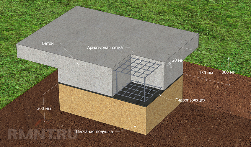 На песчаную подушку нужно уложить гидроизоляцию из 2-х слоев рубероида. Это позволит защитить бетон от воды в грунте и удержит не затвердевшую бетонную смесь от протекания в песок.