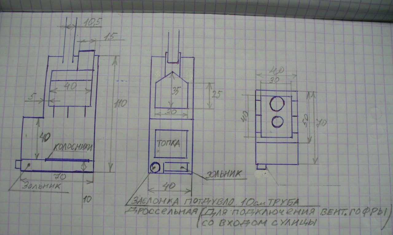 При выборе чертежа для выполнения печи своими руками учитывается ряд факторов: