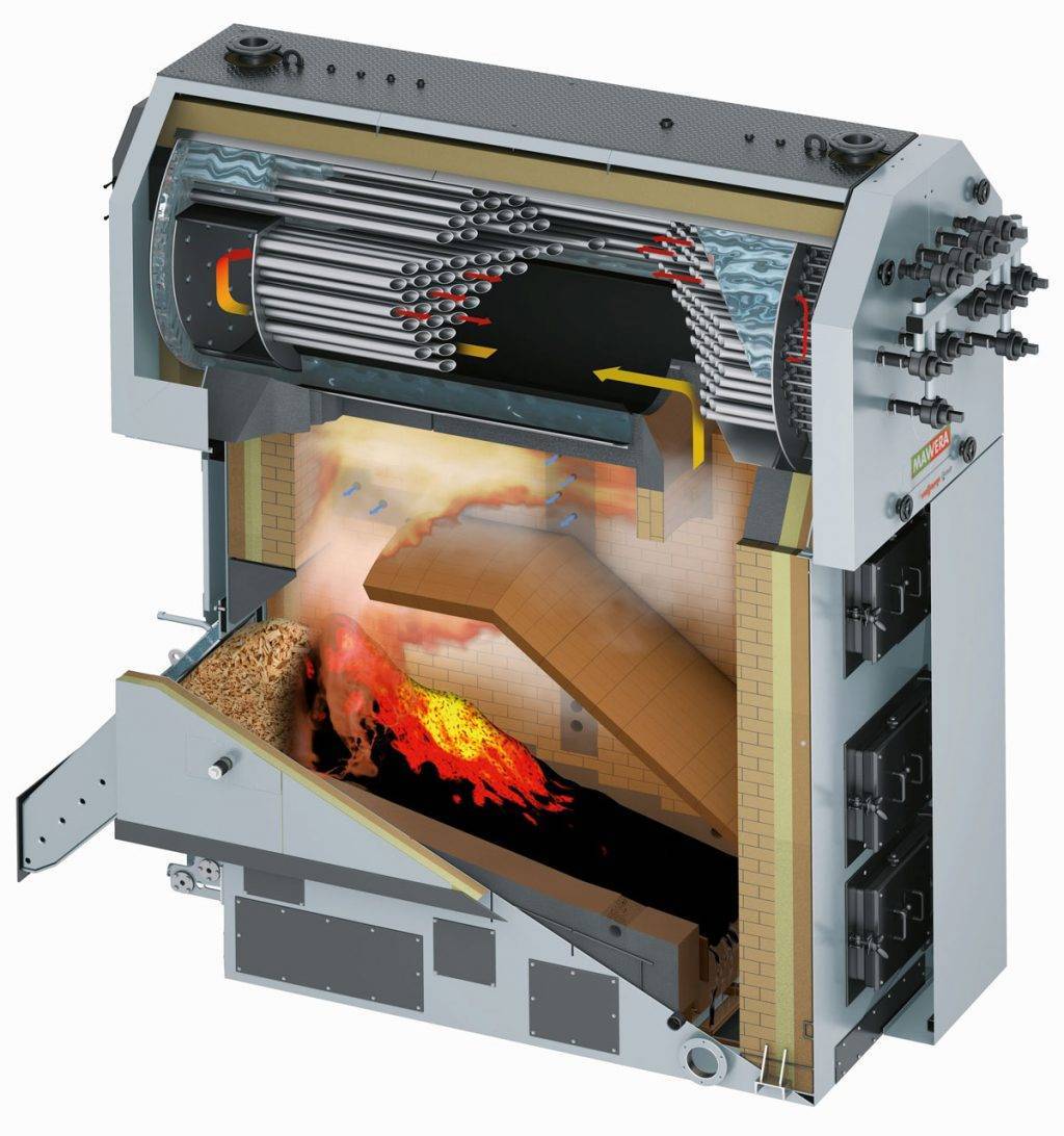 Сам процесс горения происходит в закрытом пространстве, откуда через специальную трубу, высвобождается древесный газ. Дальше нагретый газ идет во вторую, где происходит смешивание с вторичным воздухом, закаченным вентилятором.