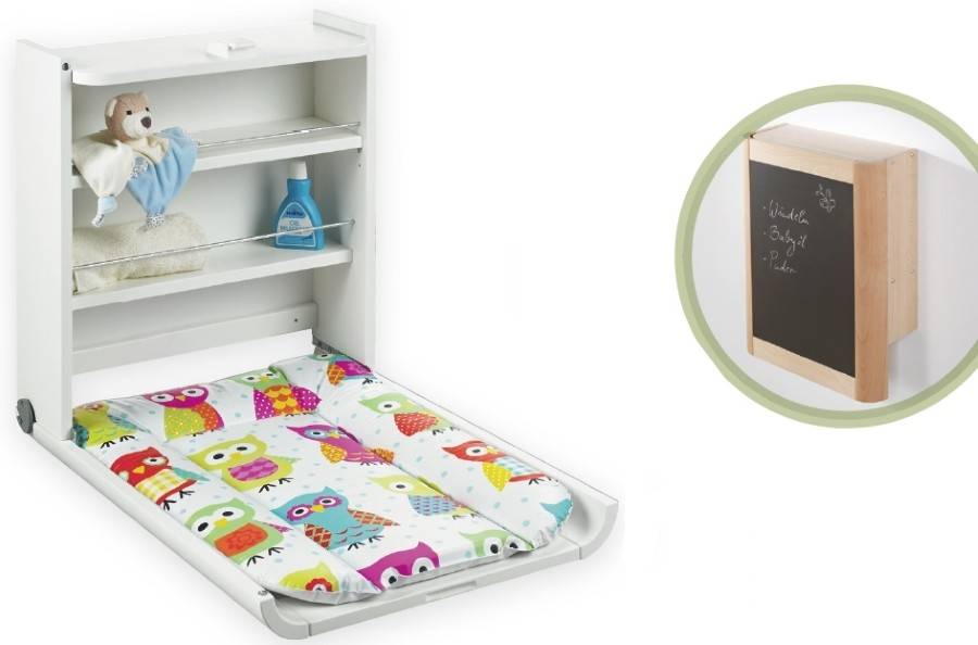 В очень маленьких комнатах целесообразна установка откидного пеленального столика, который представляет собой широкую полку с небольшими полочками для хранения зеленки, присыпки детского крема. Дополнительно можно цеплять рядом с ним специальный контейнер для подгузников. В сложенном состоянии настенный пеленатор выглядит очень компактно, отлично вписывается в интерьер и не мешает проходу.