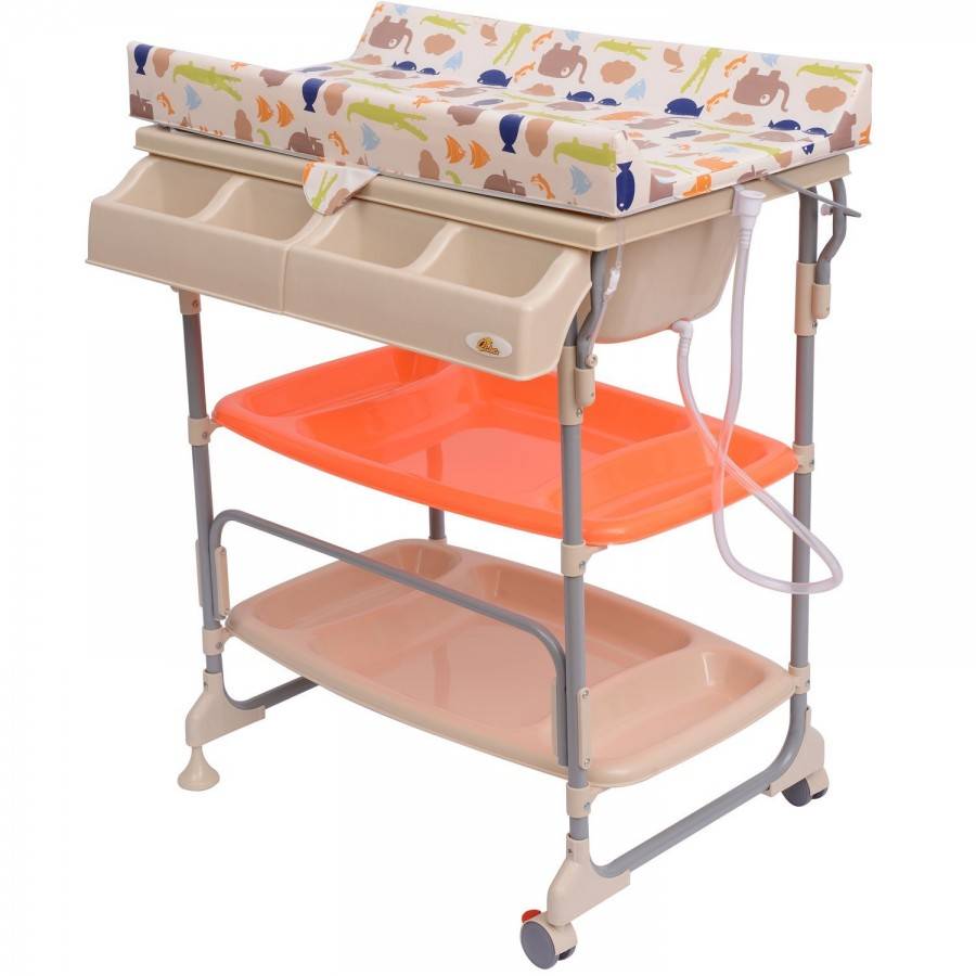 Подобные модели выполняют свою функцию отлично: на столике мама проводит все манипуляции с ребенком, а необходимые для гигиенических процедур предметы хранит на одной или двух полках, которые расположены под столешницей. Складные столики могут иметь и ванночку для купания, встроенную под съемной столешницей.