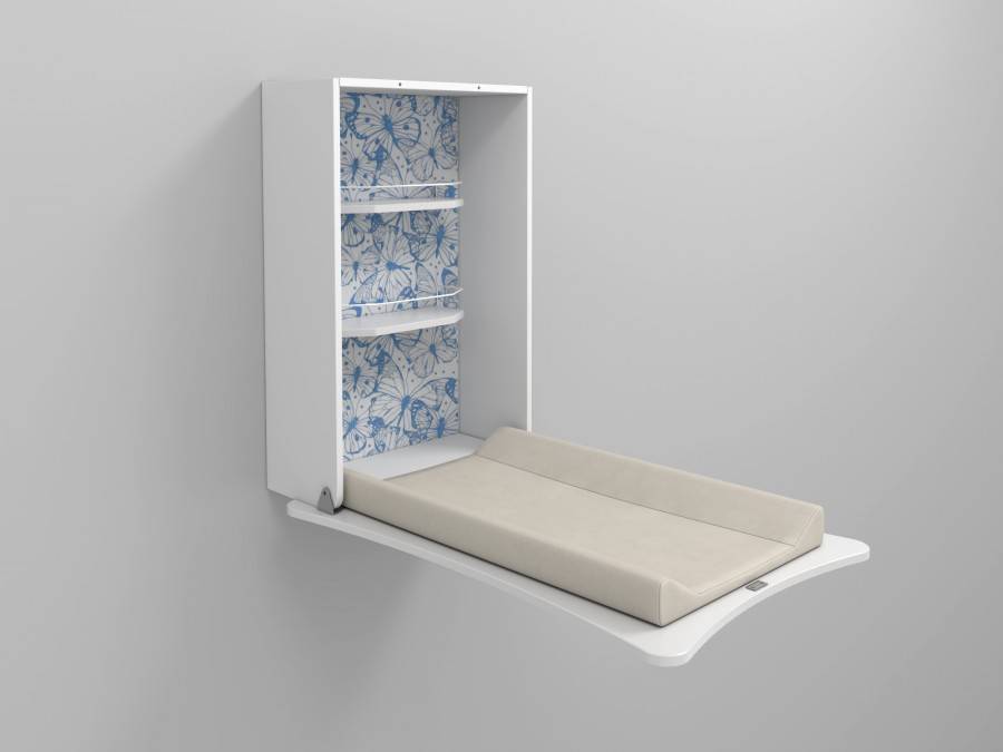 Внешне напоминает откидную столешницу. Конструкторы руководствовались идеей создать недорогие пеленальники для молодых семей, проживающих в скромных по метражу квартирах. Настенный столик имеет преимущества: компактность, умение «прятаться» – место для пеленания с функцией складывания и раскладывания – и возможность разместить тюбики и упаковки средств гигиены в специальном отсеке.