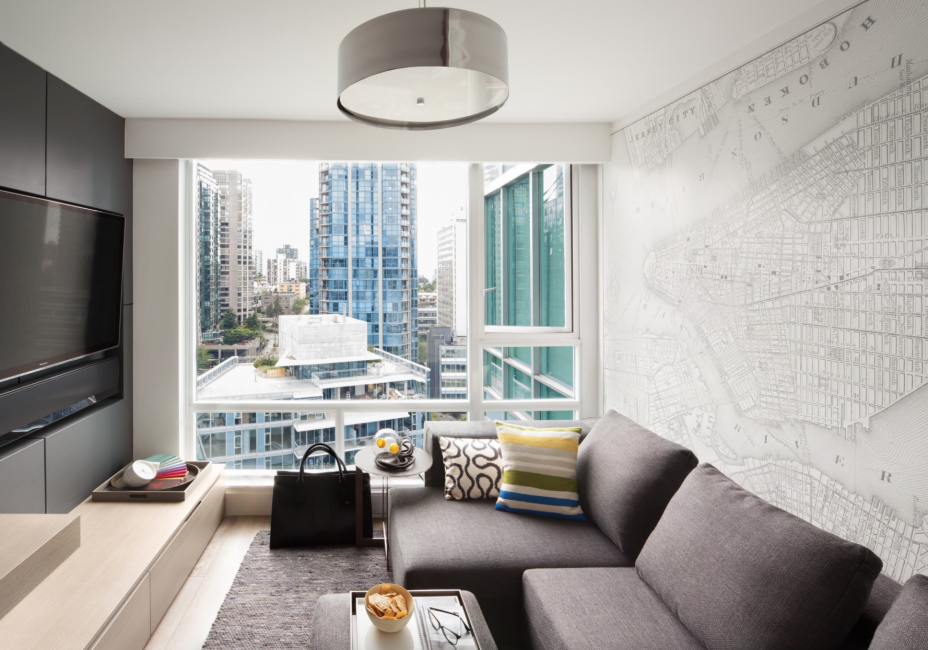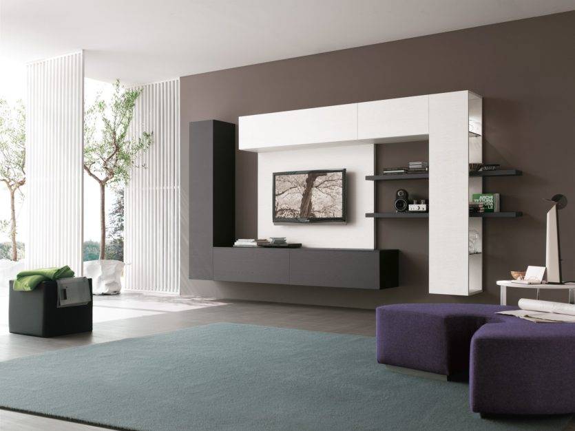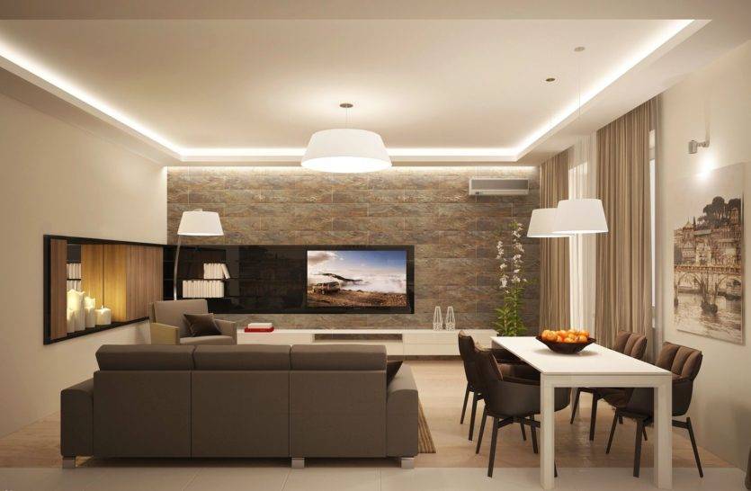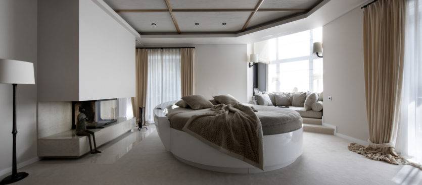 Главное помещение для отдыха в квартире должно иметь максимум открытого пространства. Создать такой интерьер помогут светлые цвета. Вещи лучше всего спрятать в ящики и шкафы. Если у вас есть возможность сделать гардеробную, это будет идеальным вариантом для решения проблемы хранения.