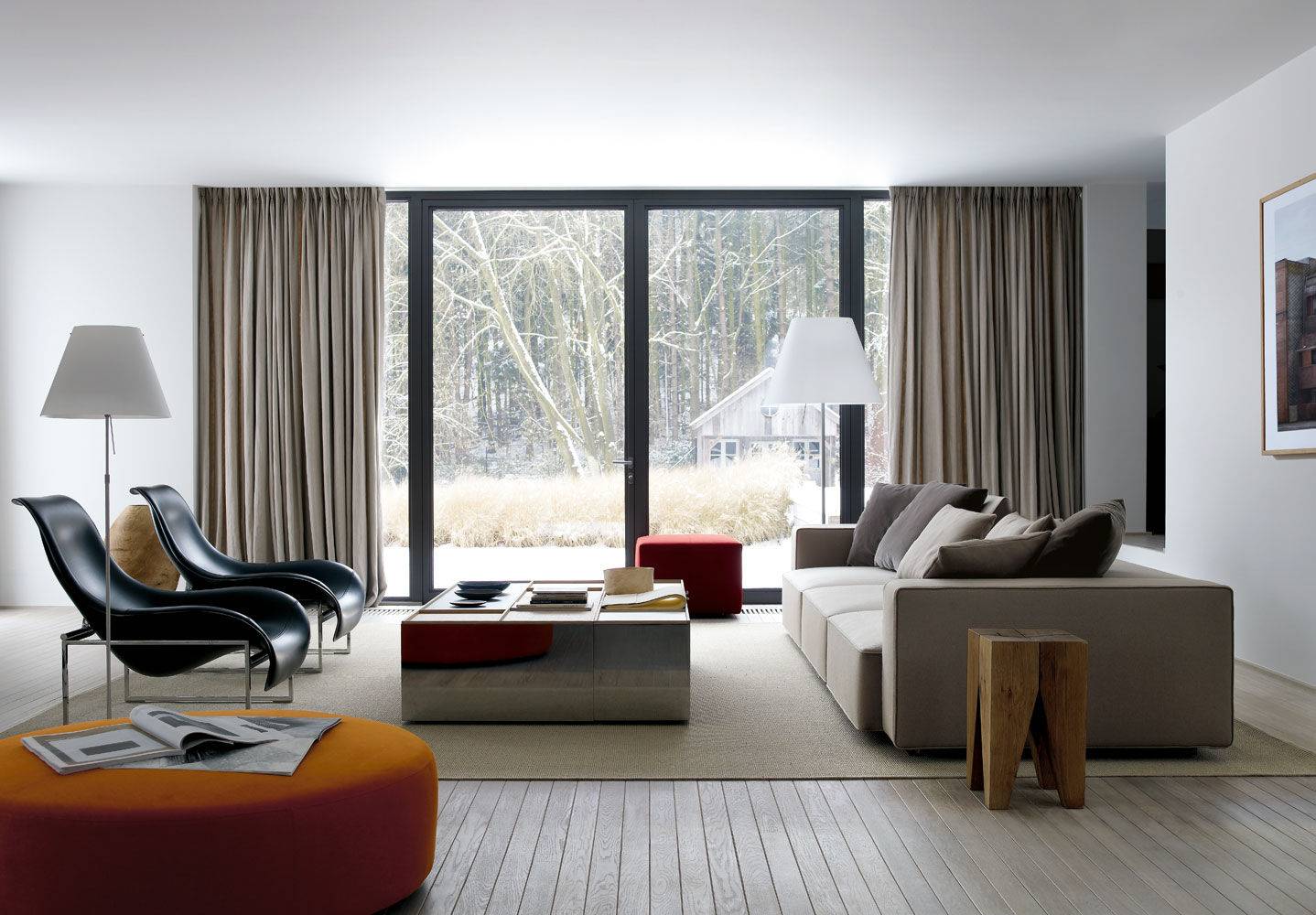 Минималистичная гостиная нередко оформляется римскими шторами, либо портьерами из богатой по фактуре ткани и легкого тюля. Если обрамление окон задумано без тюля, портьеры лучше оставить свободно спадающими, без использования подвязок.
