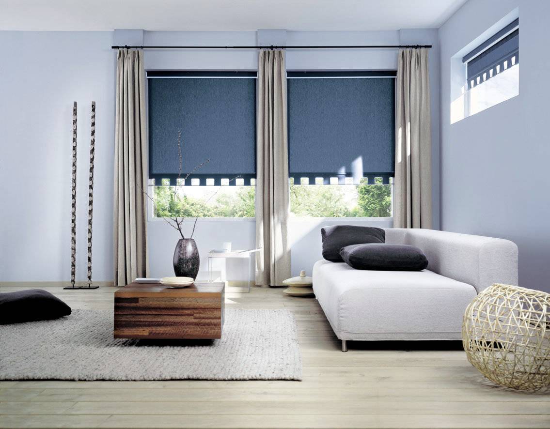 Гостиную в минимализме можно оформить римскими шторами в комбинации с портьерами.