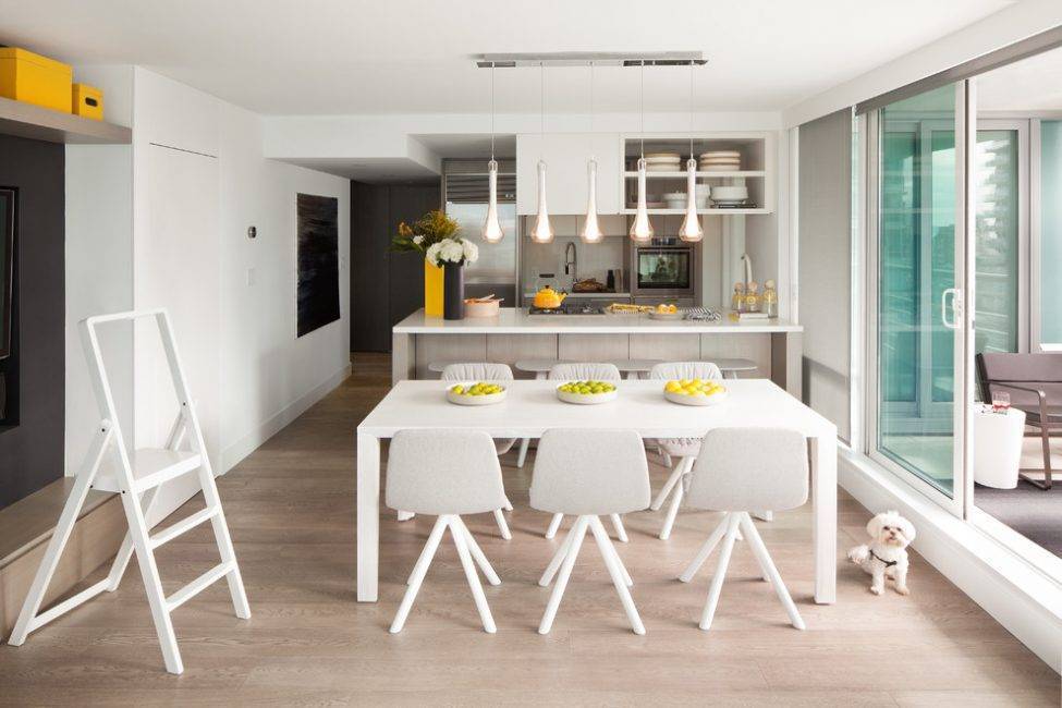 В обеденной зоне уместно повесить минималистические портьеры и тюль.