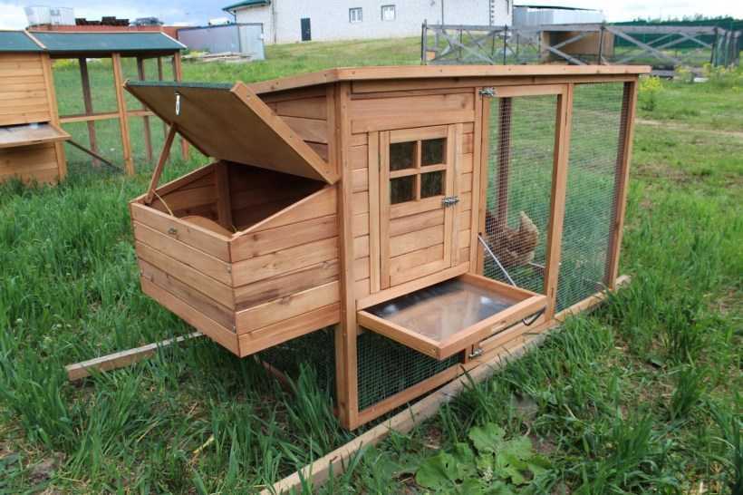 Главным нюансом переносных курятников является их легкая мобильность. Постройка может двигать по всей территории. Устройство довольно простое — двухуровневое.