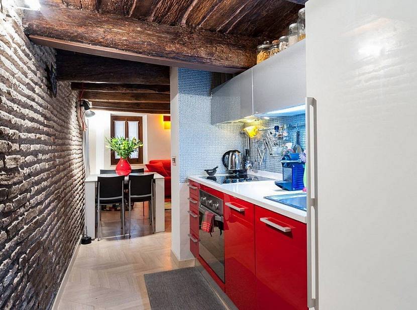 - Чтобы обстановка не выглядела монотонной, ее разнообразят вкраплениями ярких цветов — обивкой мебели, коллекцией чашек, контрастной столешницей. Плохое решение для маленькой комнаты — цветной потолок, уменьшающее ее высоту.