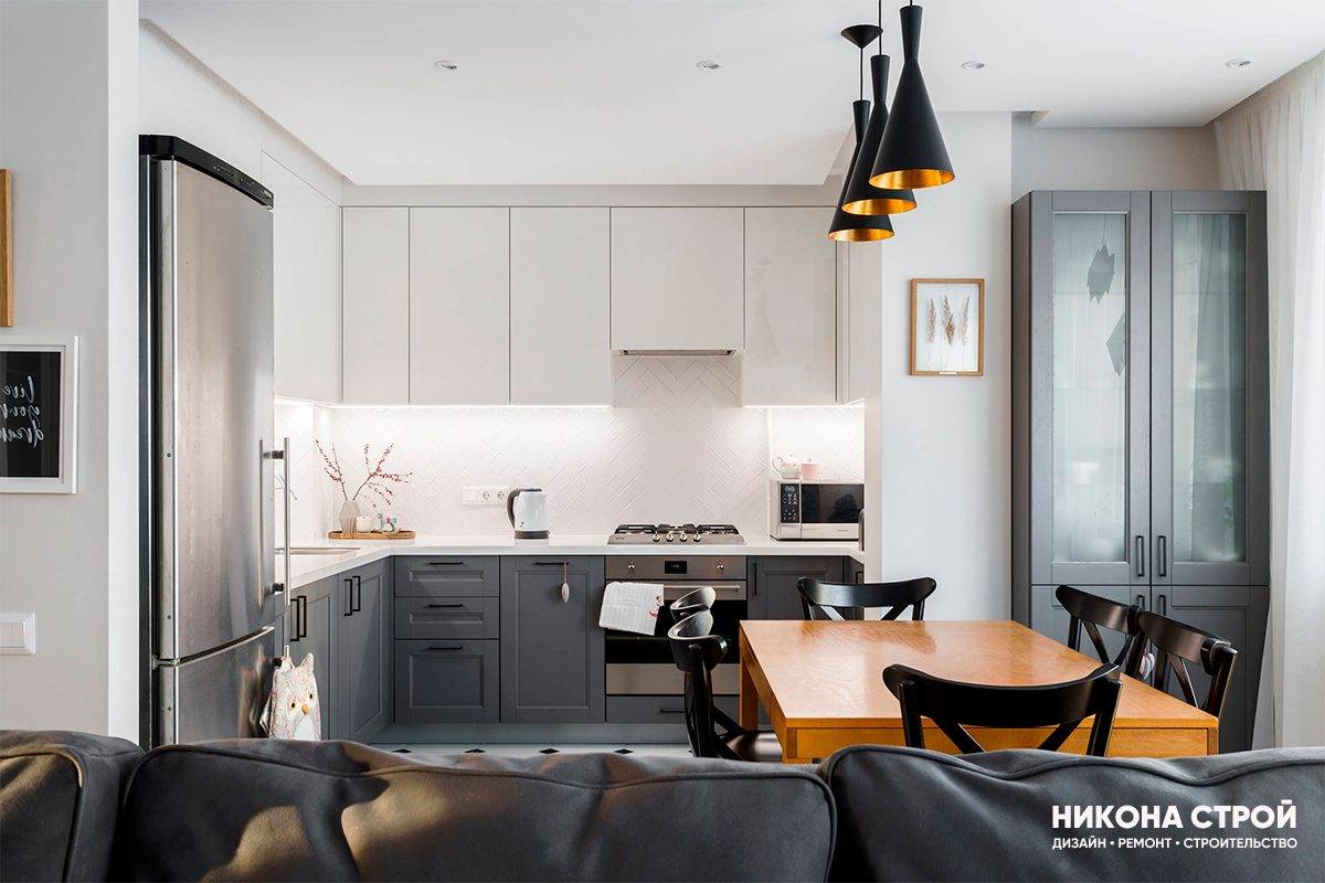 На сегодняшний день «евродвушку» можно распланировать и обустроить различными способами, при этом важно учитывать не только личные предпочтения, но и площадь квартиры. Так, для оформления небольших евродвушек могут подойти следующие варианты дизайна. Кухня, объединенная с гостиной
