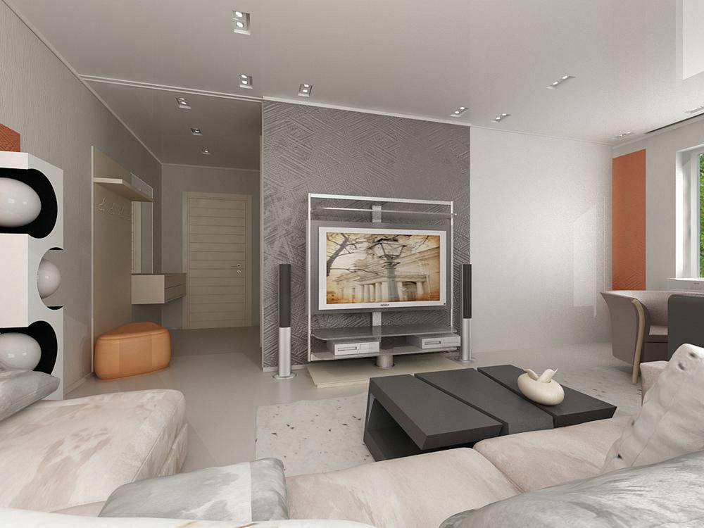 Гостиная (она же спальня) должна быть обставлена максимально функциональной мебелью – диваны-трансформеры, столики-тумбы и т. д. Необходимо продумать, какие вам нужны шкафы для одежды. Если в прихожей установить небольшой шкаф, то проблема с верхней одеждой будет решена.