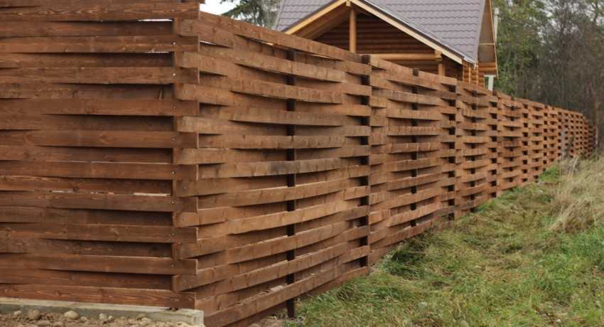 Забор из досок своими руками подходит не только для украшения участка, но и для заграждения его с внешней стороны улицы. Обычно он изготавливается из соснового пиломатериала толщиной 2-2,5 см. Столбы для ограждения можно сделать из бруса минимальной толщиной 10 см, или профильной трубы. Они устанавливаются по разметке с шагом 2,5 метра с обязательным условием – бетонирование основания. Забор с плетеными досками тяжелый, поэтому бетонное основание необходимо для его устойчивости. Доски чередуются друг с другом по горизонтали или вертикали, огибая столбы с внешней и задней стороны. Крепление осуществляется на саморезы. Столбы и доски обязательно нужно покрыть специальными защитными средствами: антикоррозийными спреями или краской по металлу, а также пропитками для дерева, защищающими от грибка, гниения и прочих вредных воздействий. Чтобы придать древесине цветной оттенок, можно покрыть забор морилкой, или фасадной краской. Краску нужно будет обновлять один раз в два года.