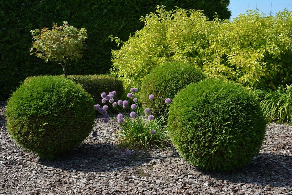 Шаровидные туи имеют плотные ветки шаровой формы. Растут они достаточно медленно, благодаря чему не нарушают композицию.