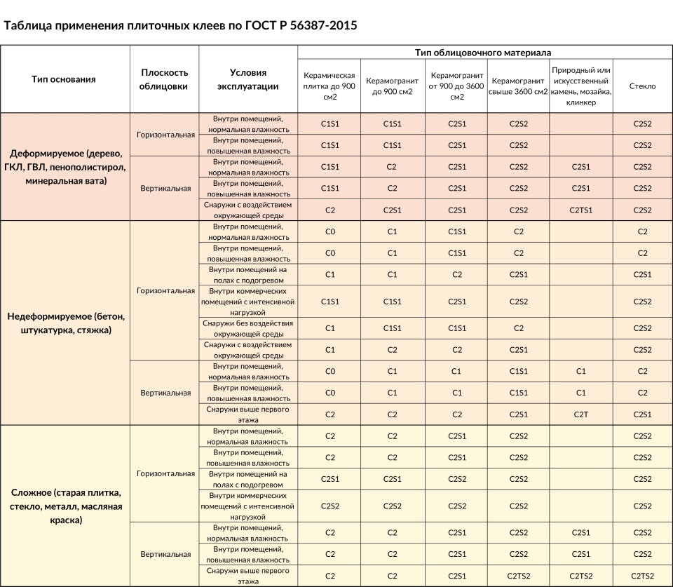 - Класс С0 — появился только в России, согласно европейским нормам, такой продукт не считается плиточным клеем. В РФ такие смеси нельзя использовать для монтажа керамогранитной плитки, даже если производители пишут, что они влагостойкие. С помощью клея класса С0 укладывают керамическую плитку с водопоглощением не менее 5% в тёплых помещениях. Часто на упаковках клея класса С0 крупным шрифтом написано «КЕРАМОГРАНИТ» и мелким шрифтом указано, что клей можно применять для монтажа керамогранита вместе с добавками, но любые изменения состава смеси и ее дальнейшее использование — на страх и риск покупателя. Керамогранит со временем может просто отпасть от неподходящего клея.