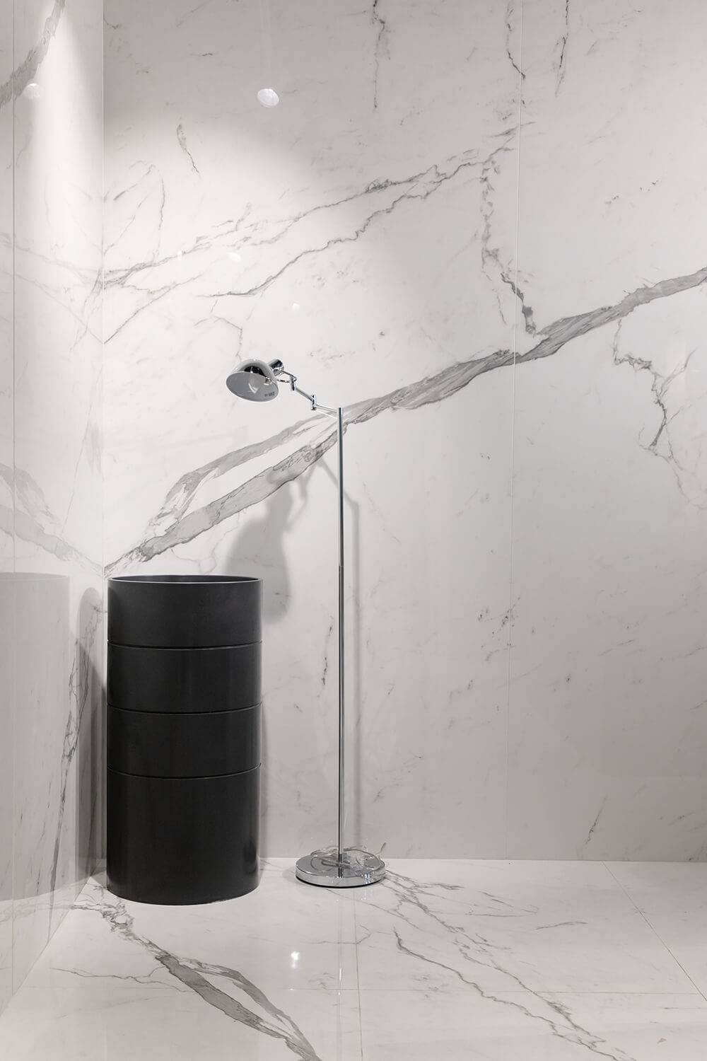 Marvel Shine. Имитация мрамора калакатта в 4 цветовых вариантах. В коллекцию входит керамогранит и настенная плитка из белой глины и декорация. Керамогранит выпускается в 12 форматах: максимальный – 160×320 см, минимальный 30х60 см. Форматы настенной плитки: 50х120 см и 40х80 см.