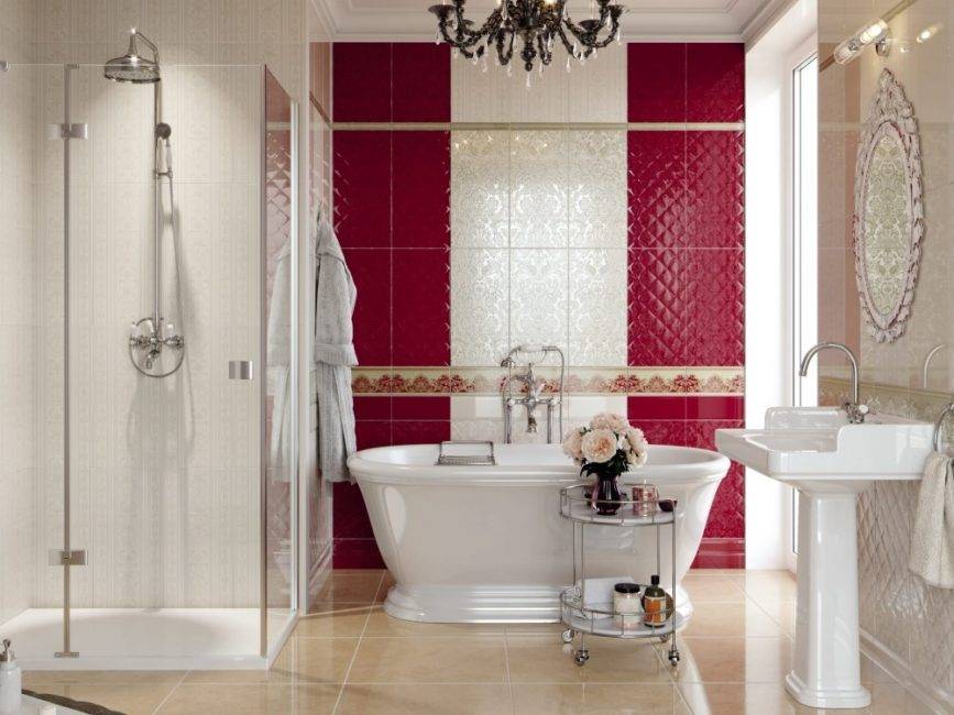 Если ваше внимание привлекает квадратный формат кафеля, то для маленькой ванной уместно будет подобрать средний размер. В просторных ванных комнатах, вы можете не отказывать себе ни в чем