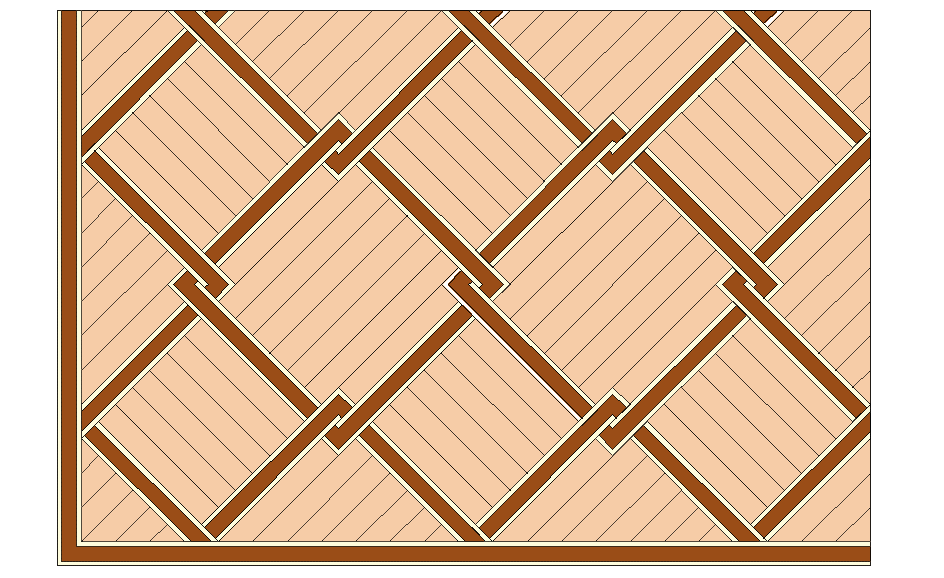 Используются плитки двух «пород дерева» Центр каждого элемента схемы — квадрат, составленный из двух узких или одной цельной плитки. Он обкладывается узкими дощечками, создающими иллюзию плетения. Контрастность цветов придает композиции глубину.