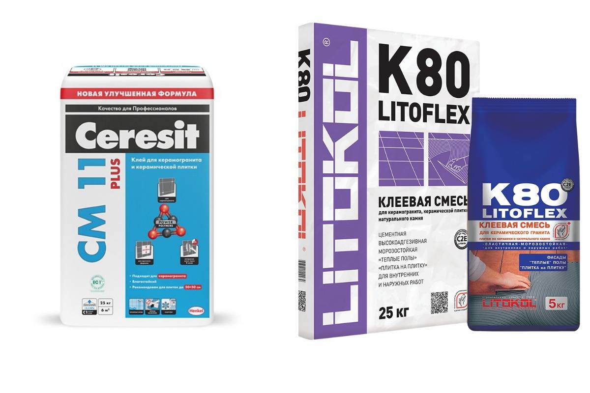 - Для работ с керамогранитом, мозаикой или натуральным камнем (например, Ceresit CM-11, Litoflex). Подходят для влажных помещений. Время полного высыхания – сутки.
