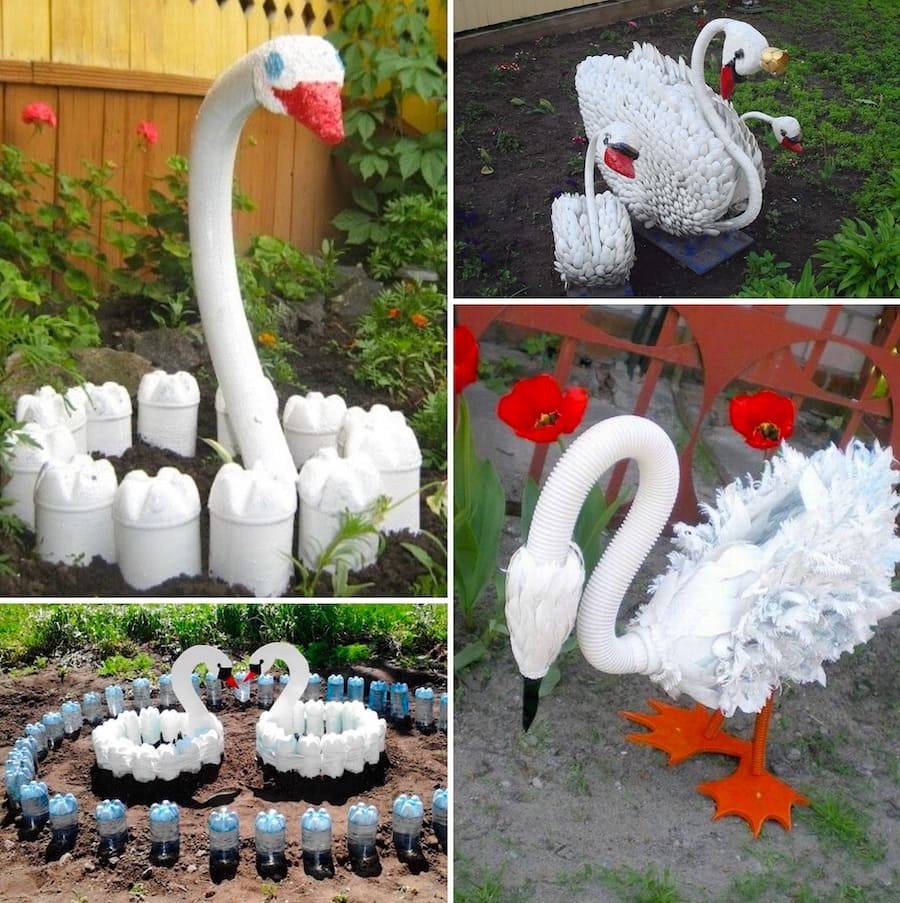 Лебедь из пластиковых бутылок может быть изготовлен по нескольким технологиям. Мы их приводим в отдельной статье. На фото представлен простой и эффектный способ: пластиковое оперение крепится на основу из фанеры.