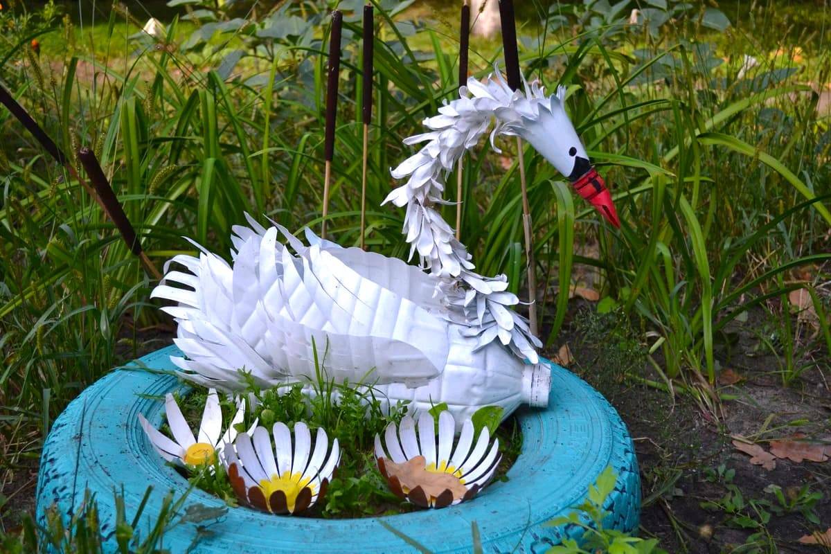 Если у вас кроме бутылок имеются еще и старые автомобильные покрышки, то соединив два этих материала можно смастерить и такую декорацию для своего участка.
