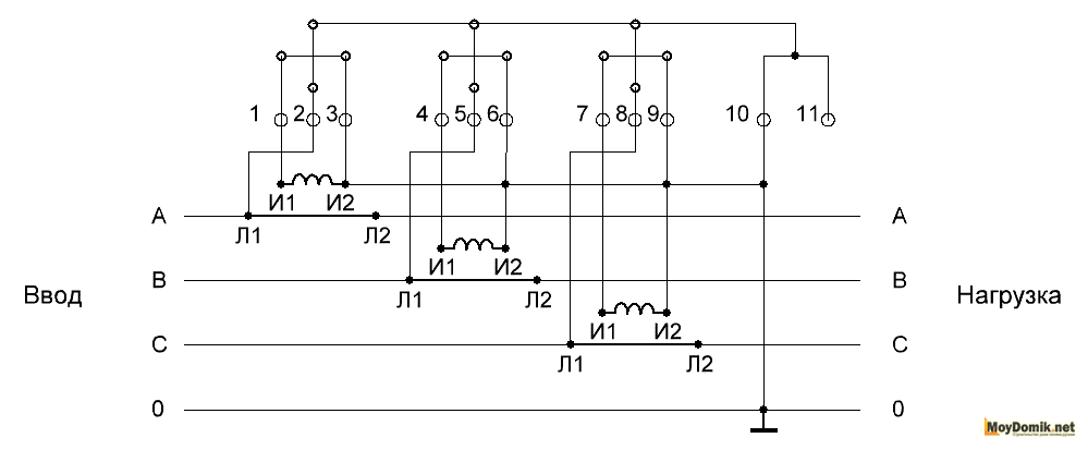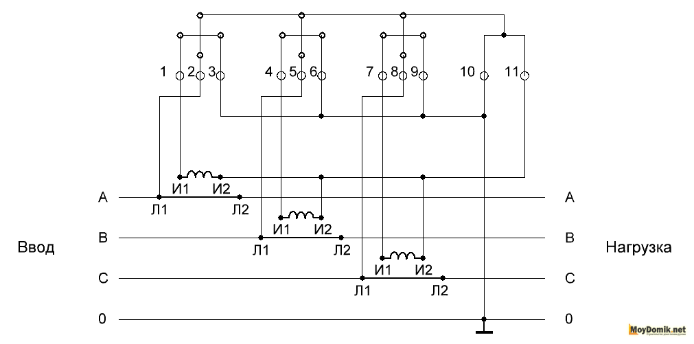 Начиная слева, каждые три клеммы, следующие по порядку, составляют одну фазу. К 1, 4, 7 клеммам, контуры подсоединяются от И1 трансформатора. К 3, 6, 9 — от И2. 2, 5, 8 — подключение цепи напряжения. 10 или 11 (Энергомера предлагает 10 и 11 клемм) — нулевой проводник (может быть любой из двух).