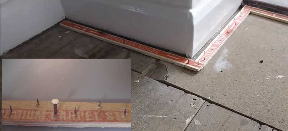 Первым делом необходимо подготовить шипованные рейки, изготовленные на основе прочной фанеры. Именно на эти рейки впоследствии можно будет зацепить мягкое напольное покрытие. Шипами являются несколько рядов гвоздей, которые выступают острием наружу. Для работы следует приобрести рейки различных размеров.