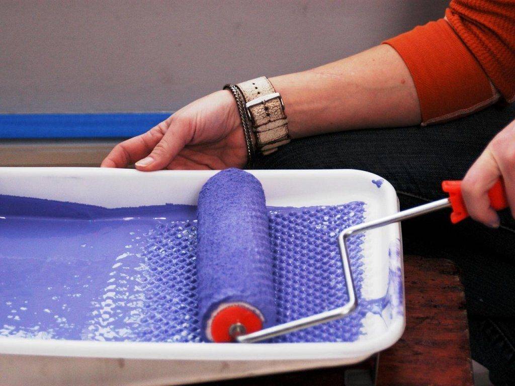 Краска разводится по прилагаемой к ней инструкции в определенном соотношении. При этом лучше оставить некоторый объем про запас, чтобы иметь возможность сохранять тональную равномерность. Валик используется с длинным ворсом: он хорошо раскатывается и минимально перекрывает полосы краски. Если же планируется покраска эмалью или иной краской, то он может быть загрунтован и самой краской, разбавленной в соотношении одна часть к пяти.