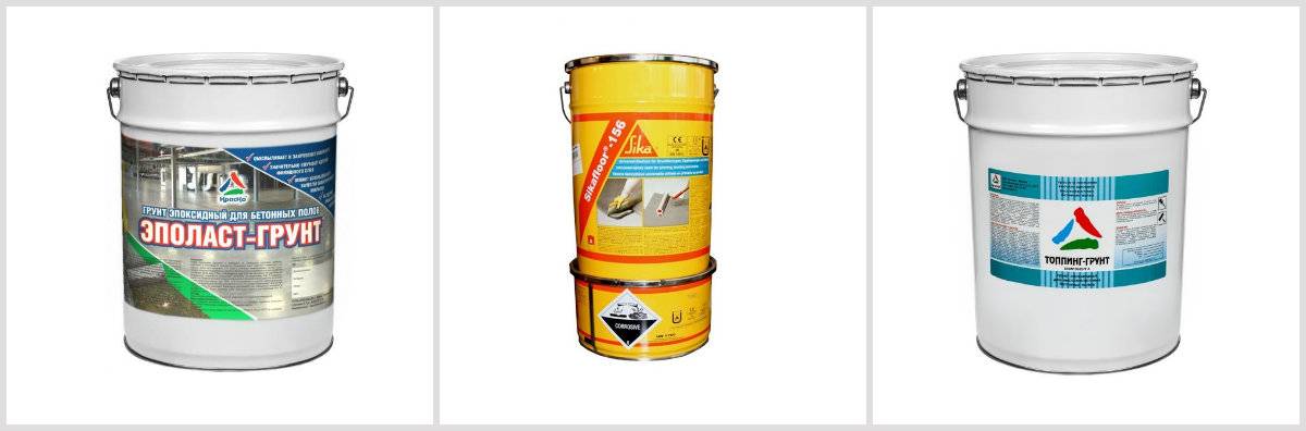 Эпоксидная грунтовка. Соответственно названию готовится на основе эпоксидной смолы, отличающейся высокой механической прочностью и высокой стойкостью к истиранию. Основная область применения – обработка наливных полов для увеличения износостойкости и под покраску. Популярные марки: «Топпинг-Грунт», «Эполаст-грунт», «Sikafloor-156 (A)».