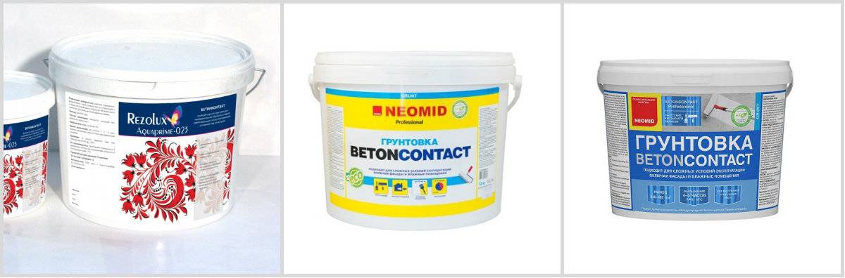 Грунтовка Бетон Контакт. Это специальный состав, обеспечивающий надежное сцепление отделочных материалов с идеально гладкой бетонной поверхностью. Для этого в состав грунтовок этого вида добавляют кварцевый песок (фракцией частиц от 0,3 до 0,6 мм) или мраморную крошку, как в материале грунтовка водно дисперсионная Бирсс Контакт, значительно повышающие сцепляемость отделочных материалов с бетонной поверхностью. Популярные марки: «БетонContact», «Neomid Бетон-контакт», «Aquaprime-023».