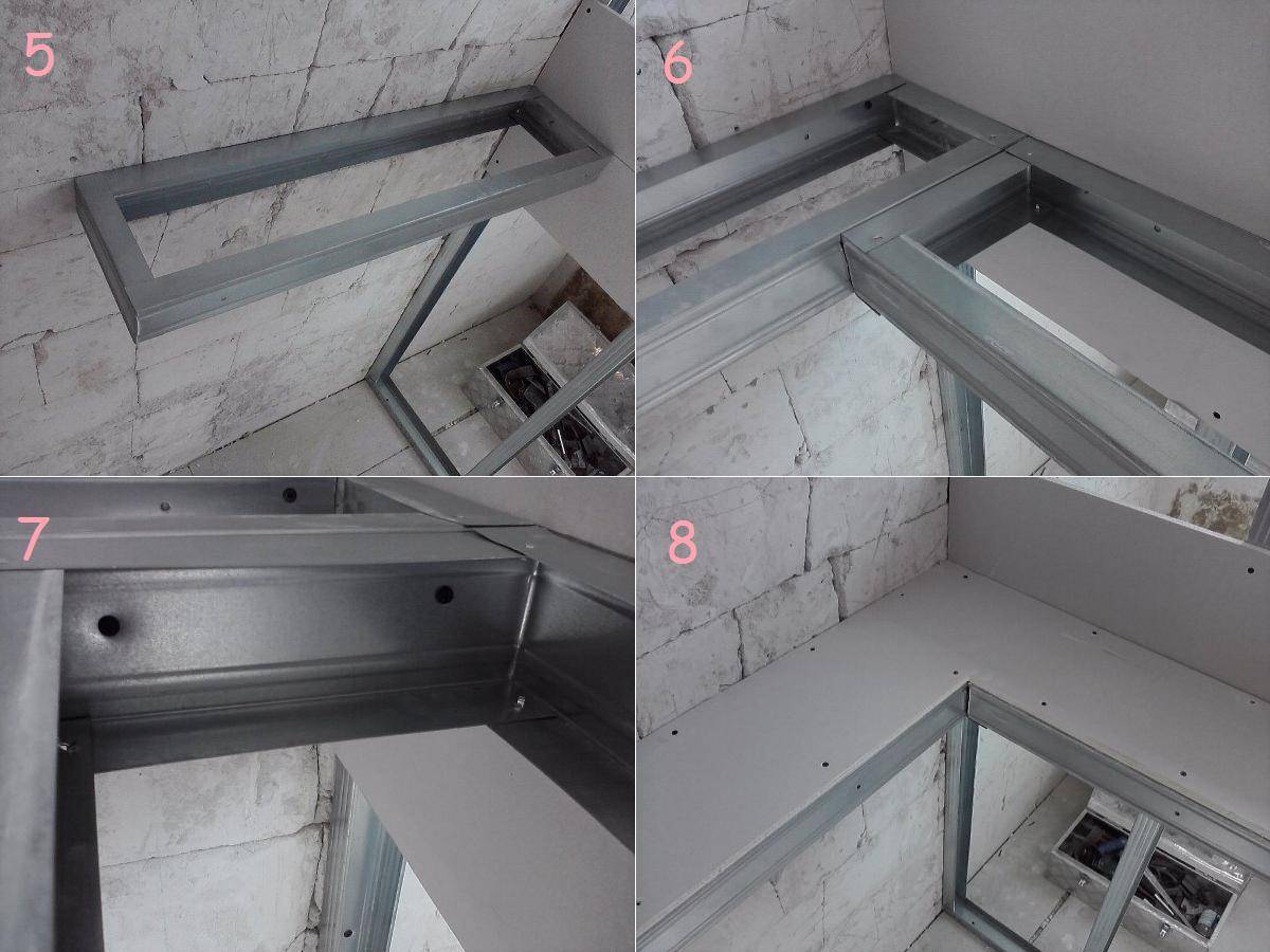 Когда конструкция из металлопрофиля готова, дело остаётся за малым — обшить её гипсокартоном. Сначала монтируются элементы верхней и нижней стороны полок, затем приходит черёд боковых. Торец зашивается в последнюю очередь. Соблюдая такой порядок действий легко подгонять детали, добиваясь максимального их прилегания и избегая перекосов конструкции.