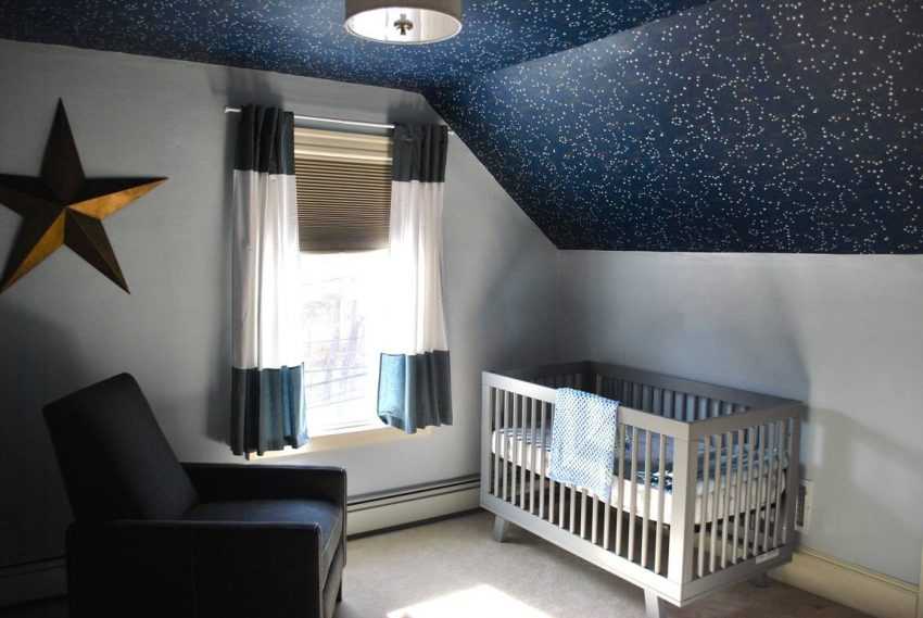 - Эффекта звёздного неба можно достичь, используя потолочные светильники или проекторы, которые заодно выполняют функцию ночника. При условии, что у человека есть задатки художника, можно расписать уже смонтированный потолок люминесцентными красками. При этом днём он будет выглядеть как обычный, а светиться начинает только ночью.