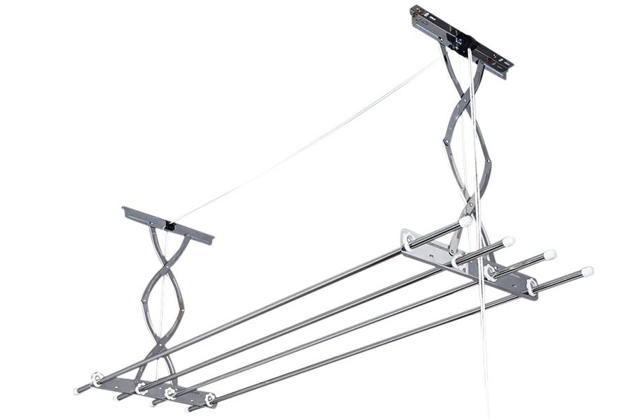 Wellex CH4200 полуавтоматическая конструкция, при помощи которой можно легко и быстро опустить или поднять штанги на нужный уровень. Крепится модель к потолку, что позволяет располагать их в помещениях любых размеров. Производят их из прочного материала устойчивого к влаге и перепадам температур. У конструкции имеются съемные и откидывающиеся балки, что позволяет сушить белье различных размеров.