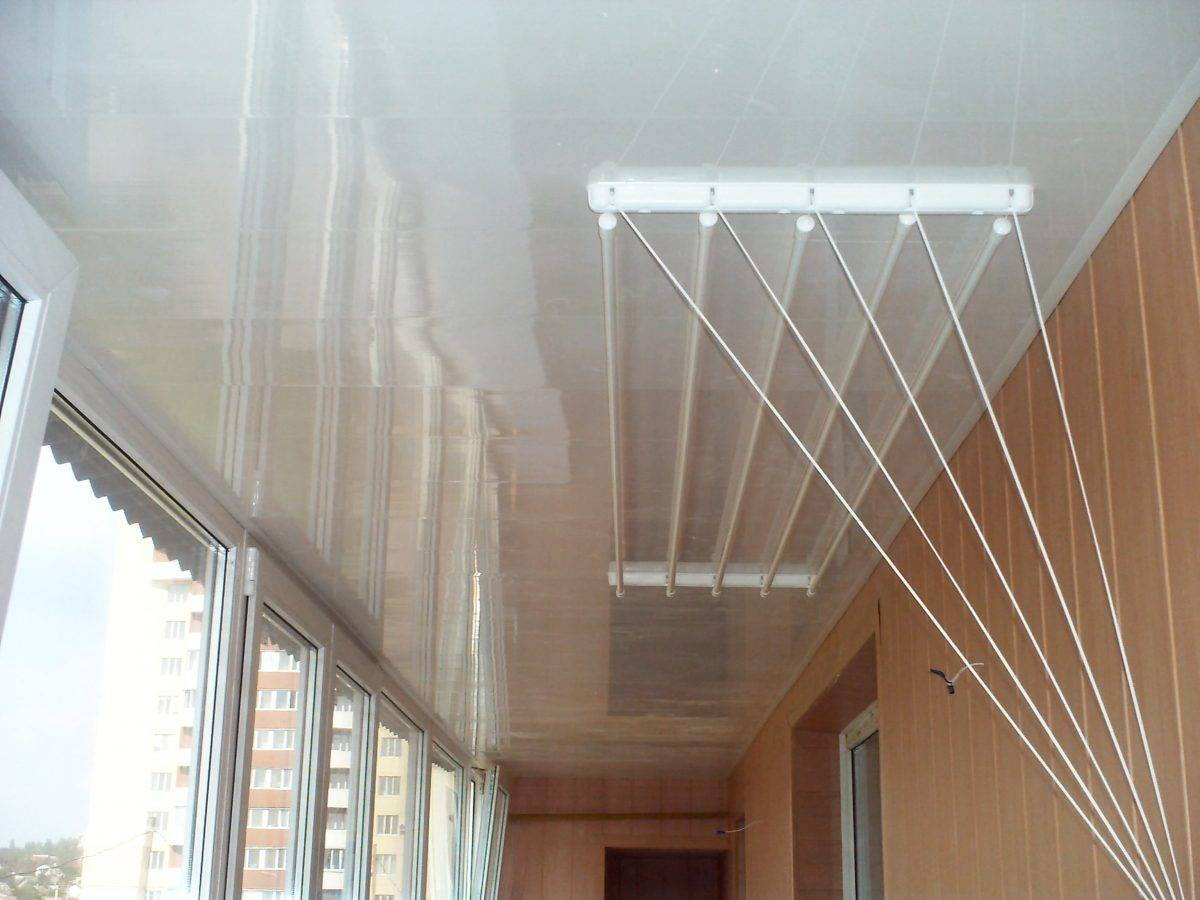 Этот вид устройств для сушки белья много в чем похож на настенные сушки, но в данном случае крепления размещаются на потолке. Из этого можно увидеть очевидное преимущество таких сушилок – они занимают минимум полезного пространства балкона, а в то время, когда не используются, складываются и становятся практически незаметными. Самые распространенные потолочные устройства – подъемные конструкции по типу лианы, в которых можно спускать перекладину на нужную высоту, чтобы было удобно развешивать стирку.