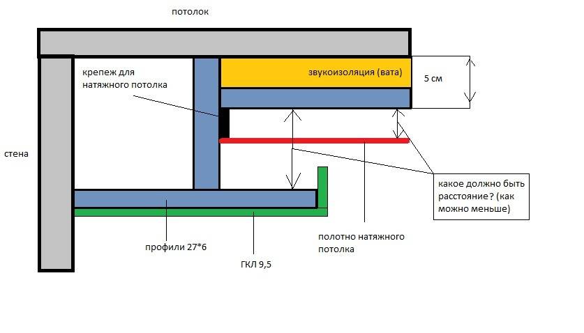 Схема монтажа короба под натяжным потолком с гипсокартонной конструкцией.