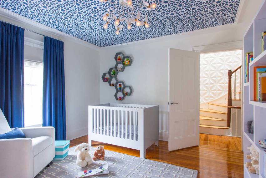 - Изобилие угловатых форм. Психологи утверждают, что округлые, обтекаемые формы элементов дизайна детской благоприятно влияют на психику ребенка. Острые углы, наоборот, ассоциируются с напряжением и агрессией. Круги, волнистые линии в оформлении потолка создадут комфорт и уют.