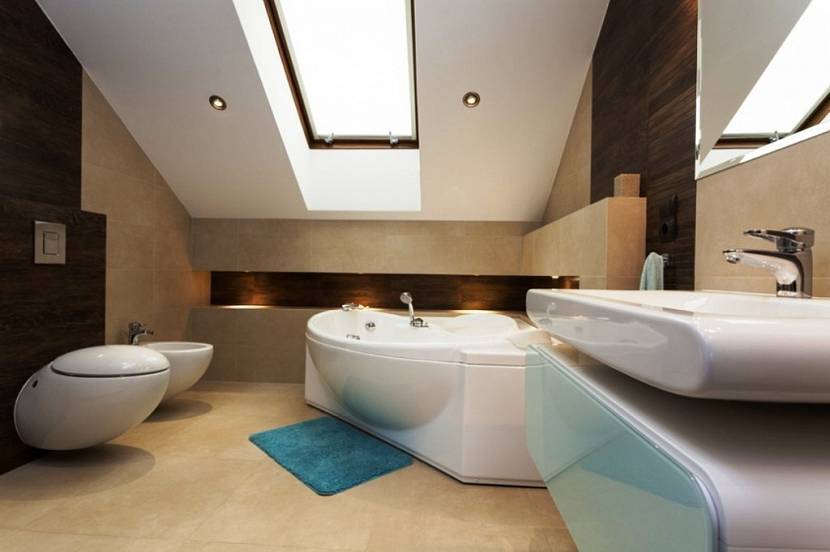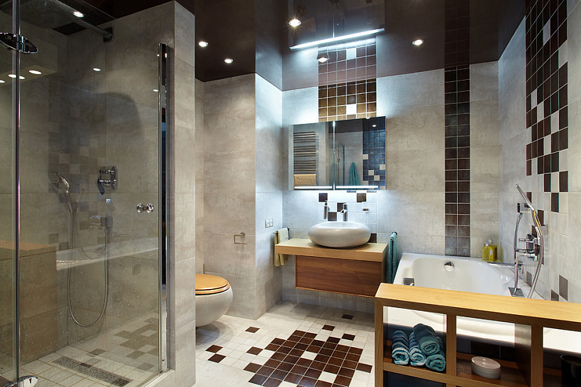 - Эффект упорядоченного и хорошо освещенного пространства — над зоной умывальника вы монтируете подвесной потолок из гипсокартона и окрашиваете его в чуть более темный цвет в зависимости от оттенка настенной плитки или пола. Для яркого эффекта не забывайте о нескольких плафонах или светодиодных полосах по всей поверхности.