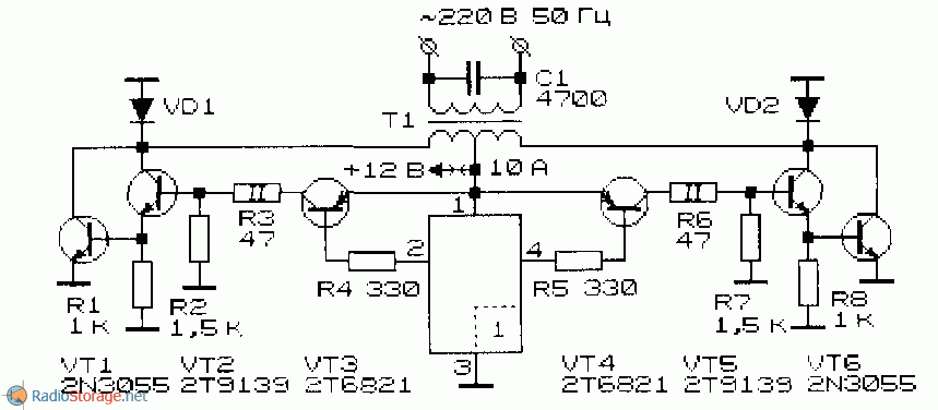 К выходам задающего генератора подключены два однотипных трехкаскадных усилителя. На вторичной обмотке Т1 получается переменное напряжение 220 В.