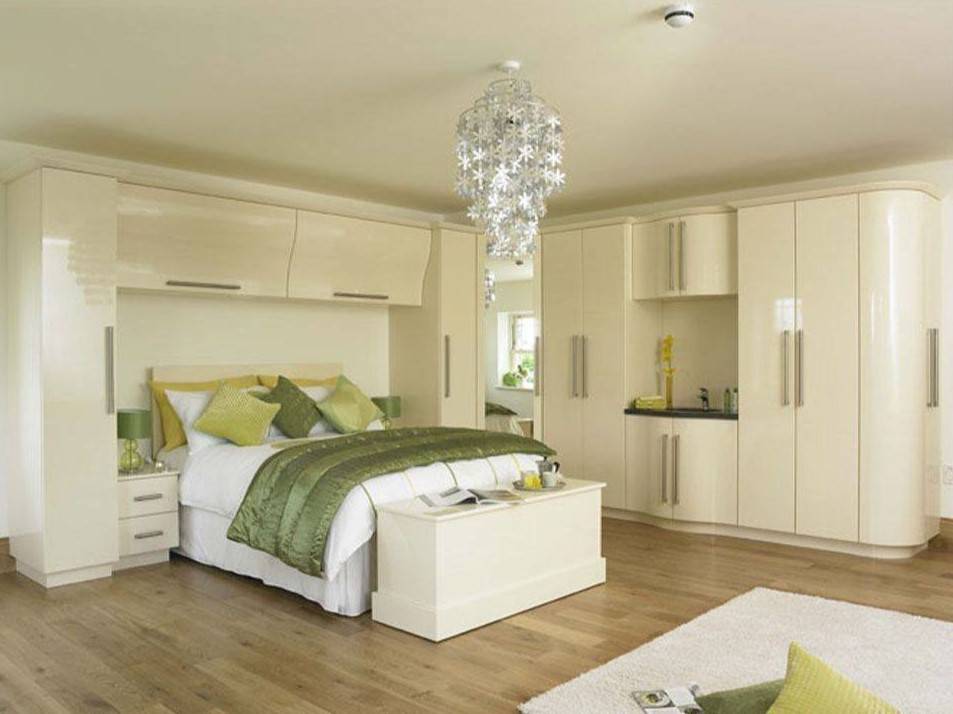 Можно использовать такие шкафы в небольших спальнях. Правильный выбор фасада мебельного гарнитура поможет акцентировано выделить зону над изголовьем спального места