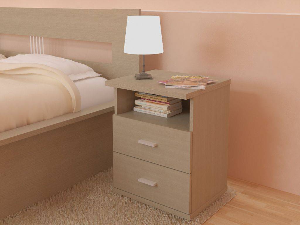 Компактная тумба представляет собой конструкцию из каркаса и ящиков, иногда со створками, иногда это вообще П-образная мебель. Ее ставят у изголовья кровати для быстрого доступа к необходимым вещам. Однако вплотную к кровати такую мебель не ставят, потому как об острые углы люди травмируются.