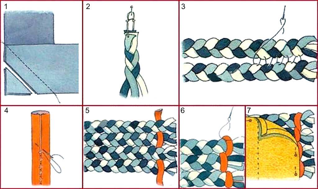Если исходная вещь трикотажная, скажем, коврик будет из старых футболок, то из нее вырезают куски побольше без швов, кантов и т.п. Карманы спарывают. Затем заготовки распускают на ленты, из тех плетут косы, а из кос шьют коврик, см. рис. Нитки – не тоньше №20. Подшивка основы из техткани обязательна, без нее трико скоро потянется и быстро протрется.