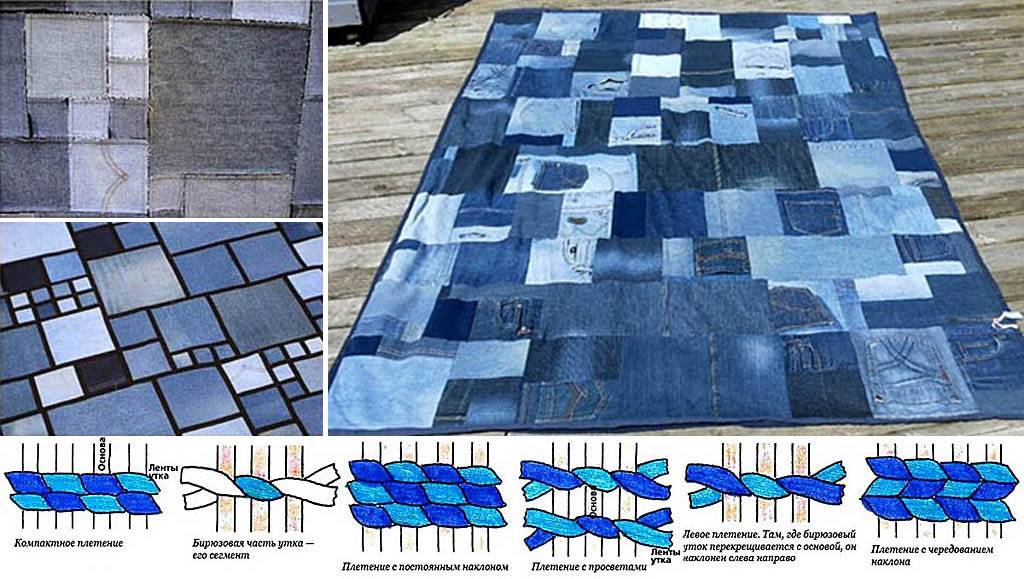 По всей совокупности качеств лучший материал для напольного коврика – джинсовая ткань, тем более, что старой джинсы в доме нередко скапливается немало. А самый простой способ сшить коврик из джинсов – порезать их на куски нужной формы и сшить с изнанки, слева вверху на рис. Джинсовый половик (справа вверху) будет приемлемо смотреться в любом интерьере, как и джинсовая одежда в любой обстановке, кроме чопорно-официозной.