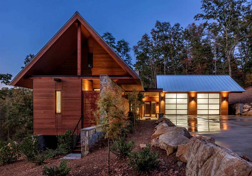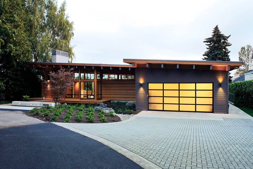 Обычно, проекты домов с мансардой и гаражом выполнены в современном стиле. Так называемый арт-деко, не предусматривает соблюдения каких-либо канонов. Здесь абсолютная свобода в выборе материалов для постройки и элементов отделки.