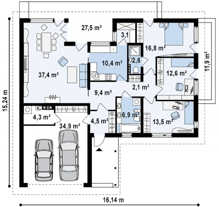 Проект одноэтажного дома из кирпича с гаражом на два авто