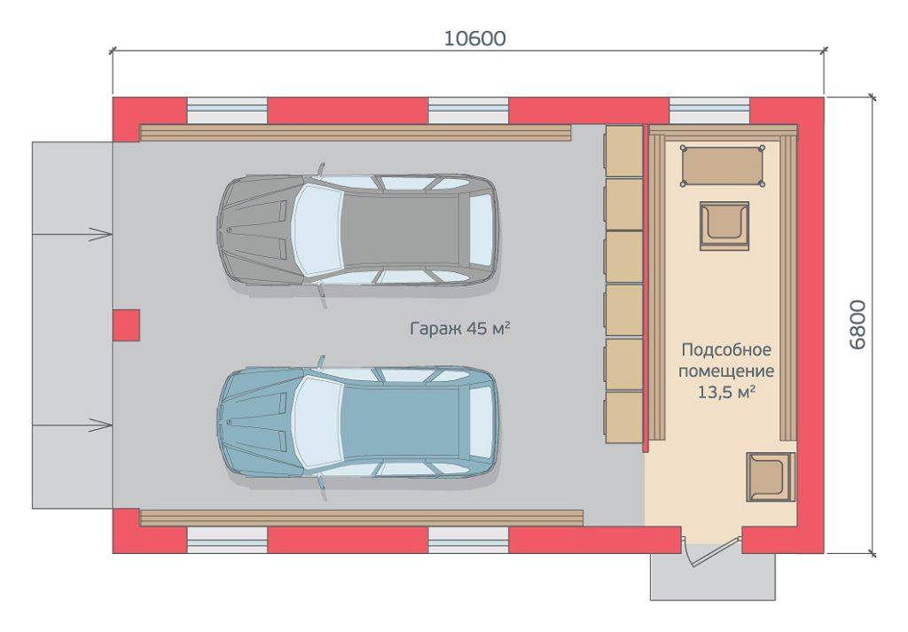 Расположение двух автомобилей в гараже принято параллельным, что является весьма удобным при одновременном использовании двух автомобилей.