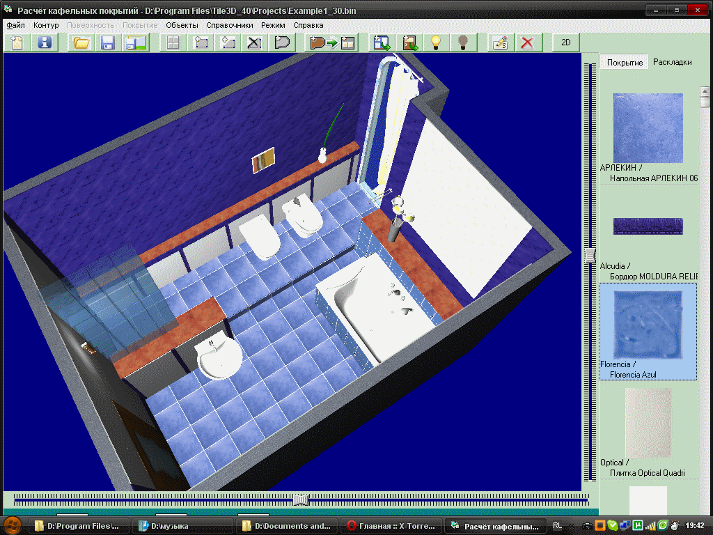 Это специализированное программное обеспечение для проектирования ванных комнат для профессионалов. Одна из функций — раскладка плитки. В базе большое число образцов — почти 39 тысяч видов плитки от разных производителей (на момент написания статьи их 362). Проект раскладки разрабатывается на основе образцов, которые есть в базе, новые вносить нельзя.