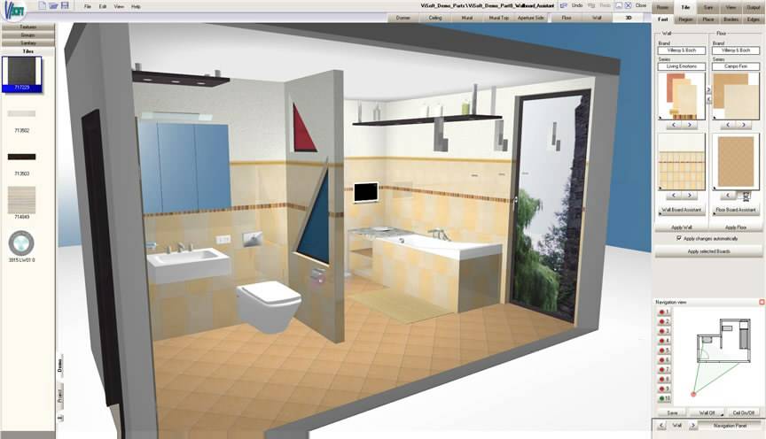 Программа для моделирования ванных комнат с функцией расчёта кафельной плитки ViSoft Premium разрабатывается с 2005 года и является 3D-программным обеспечением с интуитивно понятным интерфейсом пользователя. Софт от немецкого разработчика ViSoft GmbH обновляется несколько раз в год и обеспечивает детальное визуальное планирование раскладки плитки, выбор и установку смесителей, мебели для ванной комнаты. Программа ViSoft Premium предоставляет практически неограниченные возможности по созданию интерьера помещений с использованием керамической плитки и сантехники. Точную схему укладки плитки можно распечатать и предоставить мастерам-плиточникам.