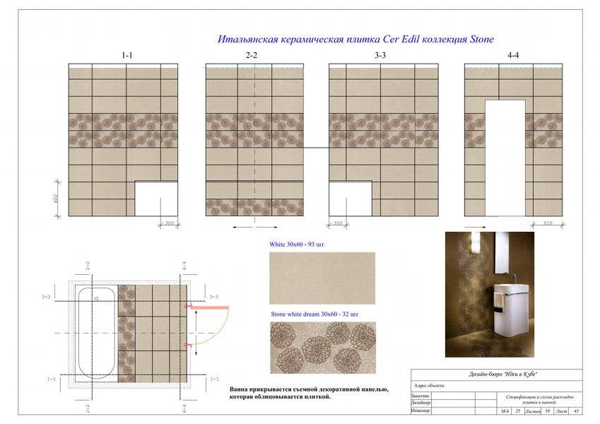 5. Дизайнер может показать Вам несколько вариантов раскладки плитки относительно углов разных стен и пола, а также перегородок, мебели и других элементов (при их наличии в проекте).