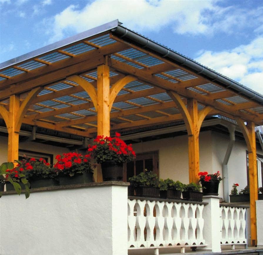 - Высокие эстетические свойства. Светопроницаемые материалы придают эффект легкости и ажурности любой конструкции. Применение этих материалов позволяет создавать неповторимые по своему стилю конструкции. Независимо от того, будет ли это веранда, навес или беседка, Прозрачные кровельные материалы придают неповторимость и стиль не только отдельным постройкам, но и всему участку в целом.