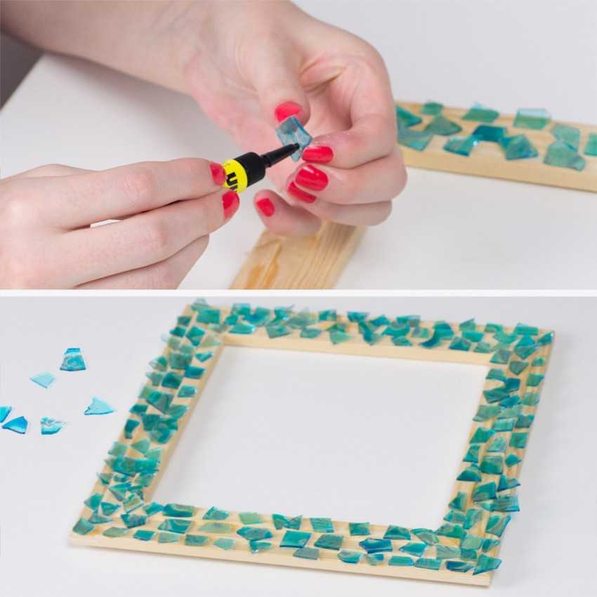 Каждую деталь из картона склеивают друг с другом, формируя место для вставки зеркала. Когда рама для зеркала крепится к толстой основе, прошлые пункты руководства опускаются.